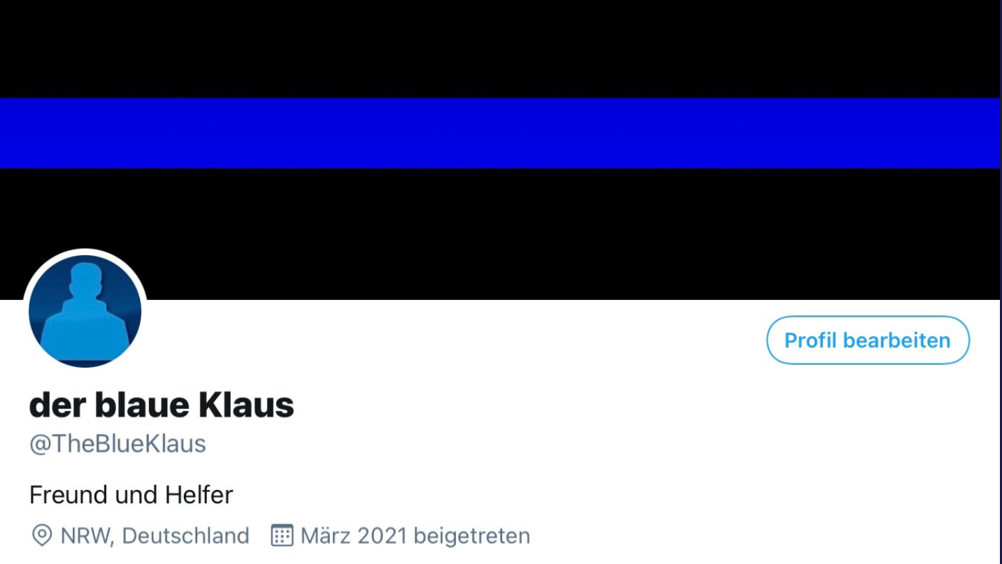 Los ging es mit einem Handle, das einen Polizeibezug aufweist - auch da passte "Blau" ganz gut - und einem Header - was liegt näher als eine #ThinBlueLine als Bekenntnis übers Profil zu packen.