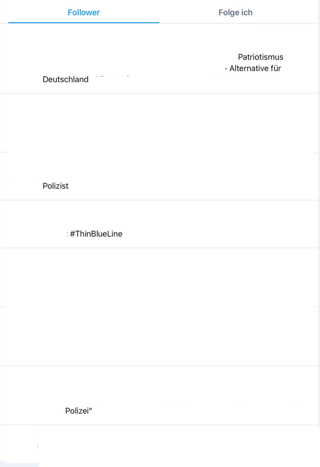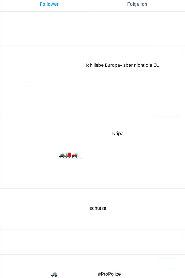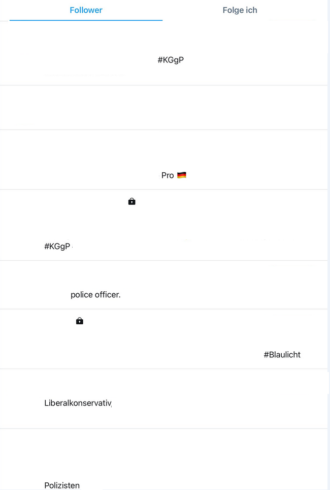 Von den ca. 60 Accounts zeichneten sich viele durch einen direkten Polizeibezug in der Bio aus, wie "Polizist", "TBL", einem "Polizei-Emoji" oder einem Bezug zu "KggP" (Keine Gewalt gegen Polizisten e. V.) - gesamt ca. 75%.