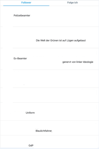 Von den ca. 60 Accounts zeichneten sich viele durch einen direkten Polizeibezug in der Bio aus, wie "Polizist", "TBL", einem "Polizei-Emoji" oder einem Bezug zu "KggP" (Keine Gewalt gegen Polizisten e. V.) - gesamt ca. 75%.