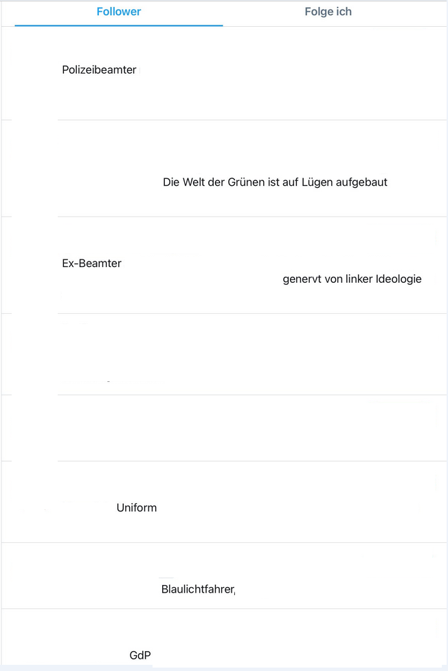 Von den ca. 60 Accounts zeichneten sich viele durch einen direkten Polizeibezug in der Bio aus, wie "Polizist", "TBL", einem "Polizei-Emoji" oder einem Bezug zu "KggP" (Keine Gewalt gegen Polizisten e. V.) - gesamt ca. 75%.